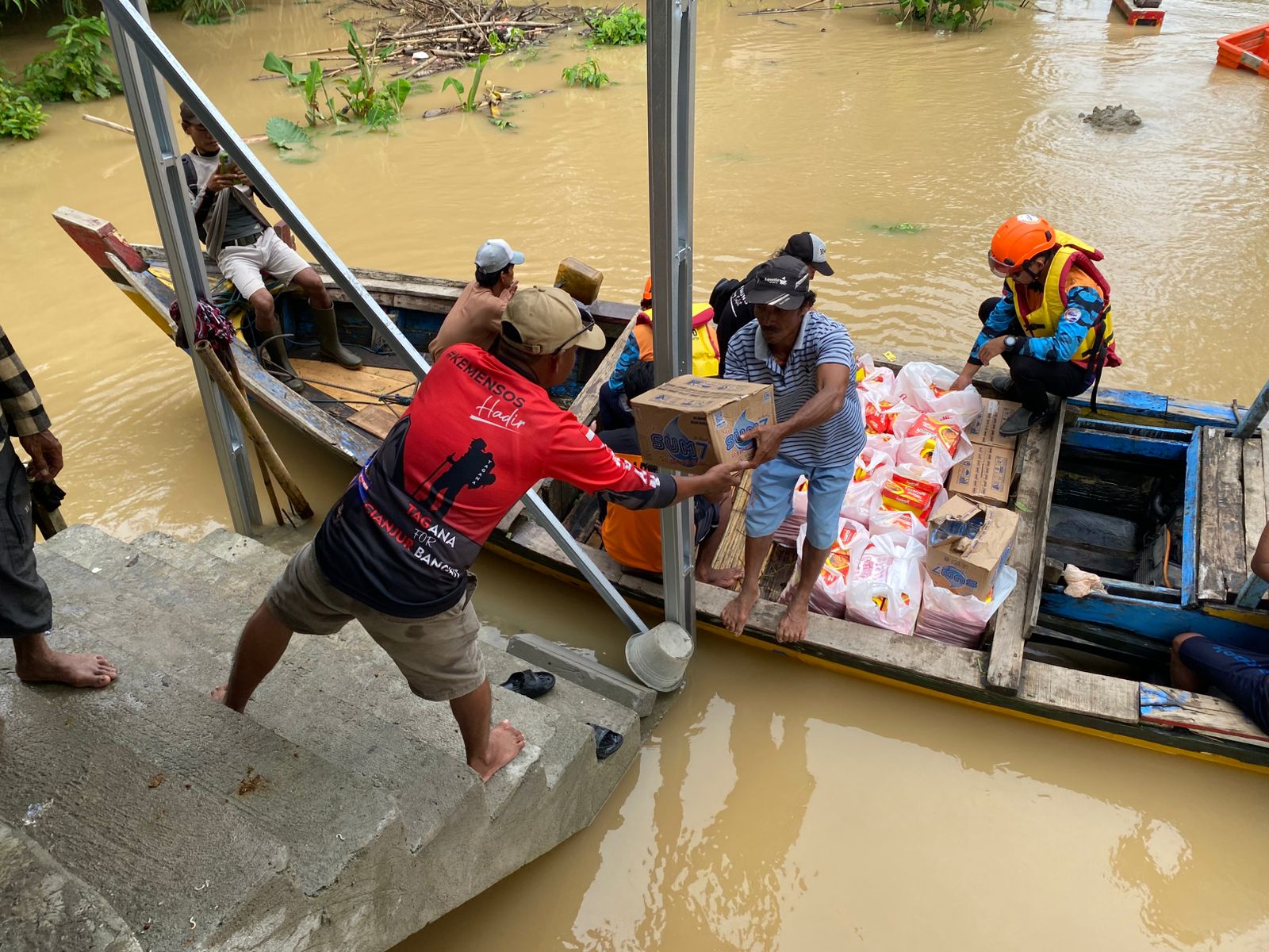 Dalam kegiatan ini relawan juga secara langsung turun menyusuri sungai mengunakan rakit sampan dan memberikan ratusan paket makan siap saji yang sudah dikemas secara langsung di dibagikan dari rumah kerumah.