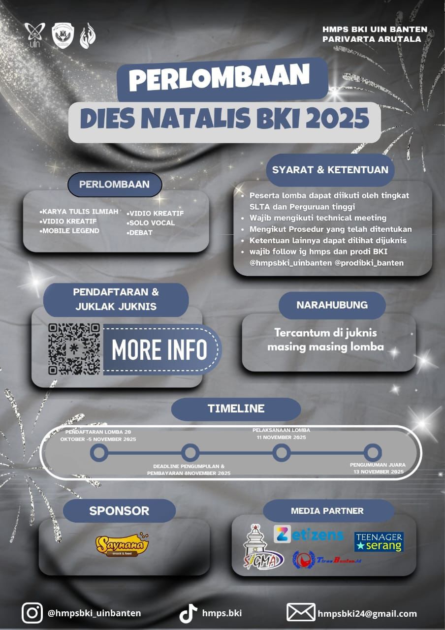 Serang, tirasbanten.id – Himpunan Mahasiswa Program Studi (HMPS) Bimbingan Konseling Islam (BKI) Universitas Islam Negeri (UIN) Sultan Maulana Hasanuddin (SMH) Banten akan memeriahkan Dies Natalis pada hari Selasa (11/11/25).