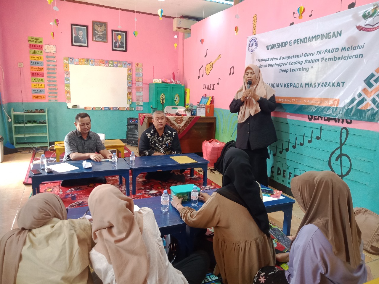 Dokumentasi kegiatan menunjukkan antusiasme tinggi dari para peserta. Mereka terlibat aktif dalam sesi praktik dan simulasi mengajar menggunakan media non-digital untuk mengenalkan konsep algoritma dan logika kepada anak didik.